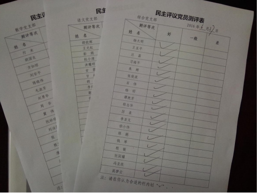 首先各位党员回顾总结自己半年来的工作,认真开展批评与自我批评,各自汇报了思想和工作情况,真正做到开诚布公,坦诚相见,敢于暴露自己的真实思想,互相交流意见和开展批评,互相帮助、互相监督。接着是民主评议党员。发放《民主评议党员---党内测评表》,通过民主测评,全体党员均为合格以上。最后,以不记名投票,选出一位优秀党务工作者(汪菡同志)和两名优秀党员(张俊波同志、程志华同志),将经过校委会审议,在七一“主题党日+” 活动进行表彰。