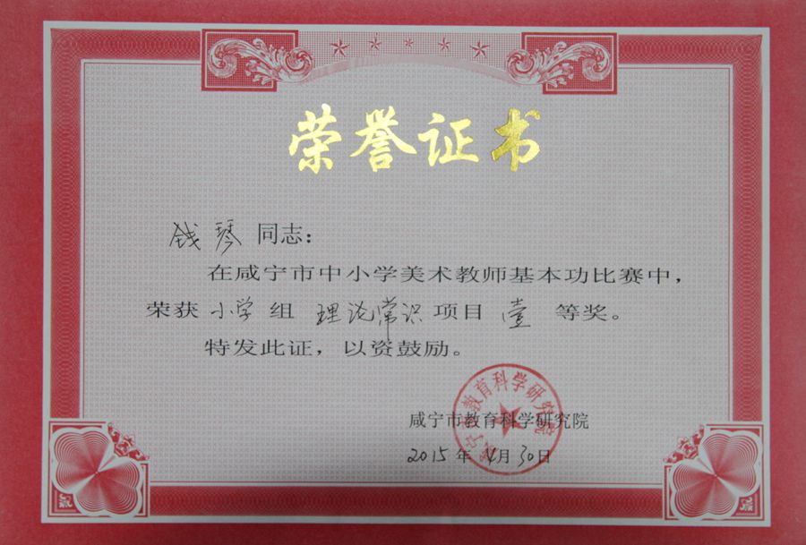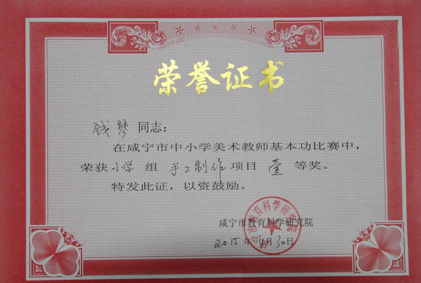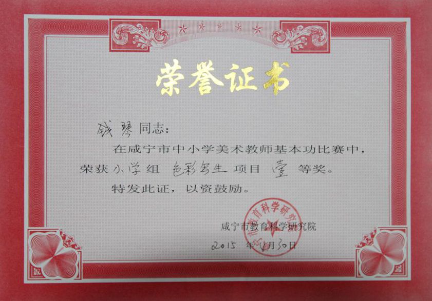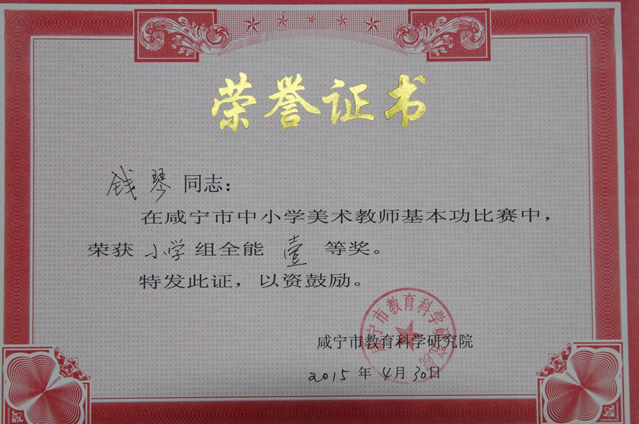 理论考试、手工制作、色彩写生、国画技能、电脑设计,堪称五项全能的咸宁市中小学美术教师技能大赛于4月27至30日在崇阳县三小举行,安博(中国)钱琴老师荣获小学美术组全能奖第一名。