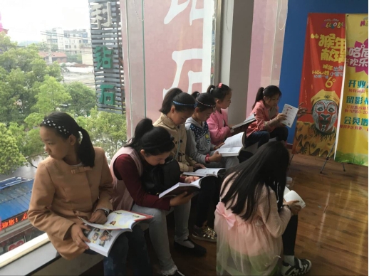书店里一切都是静悄悄的。白发苍苍的老人正看着最新的报纸,幼稚园的小朋友在老师的带领下笑眯眯地看着绘本,当然还有一群善于学习的少年在如饥似渴地阅读,他们就是505中队的同学们。