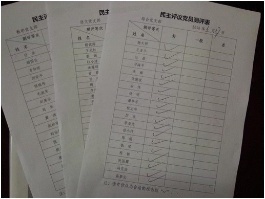 首先各位党员回顾总结自己半年来的工作,认真开展批评与自我批评,各自汇报了思想和工作情况,真正做到开诚布公,坦诚相见,敢于暴露自己的真实思想,互相交流意见和开展批评,互相帮助、互相监督。接着是民主评议党员。发放《民主评议党员---党内测评表》,通过民主测评,全体党员均为合格以上。最后,以不记名投票,选出一位优秀党务工作者(汪菡同志)和两名优秀党员(张俊波同志、程志华同志),将经过校委会审议,在七一“主题党日+” 活动进行表彰。