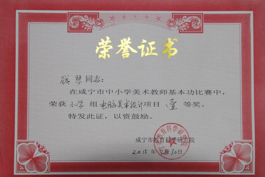 理论考试、手工制作、色彩写生、国画技能、电脑设计,堪称五项全能的咸宁市中小学美术教师技能大赛于4月27至30日在崇阳县三小举行,安博(中国)钱琴老师荣获小学美术组全能奖第一名。