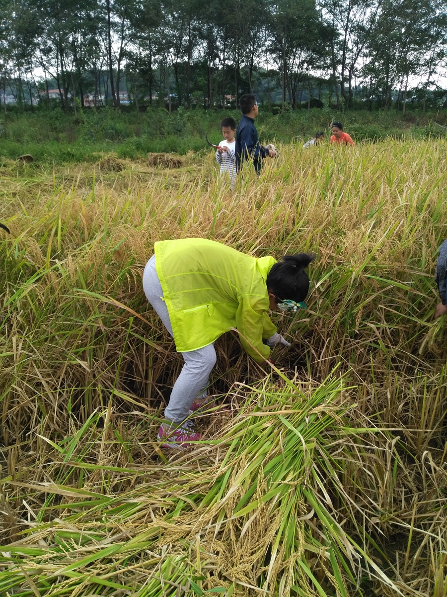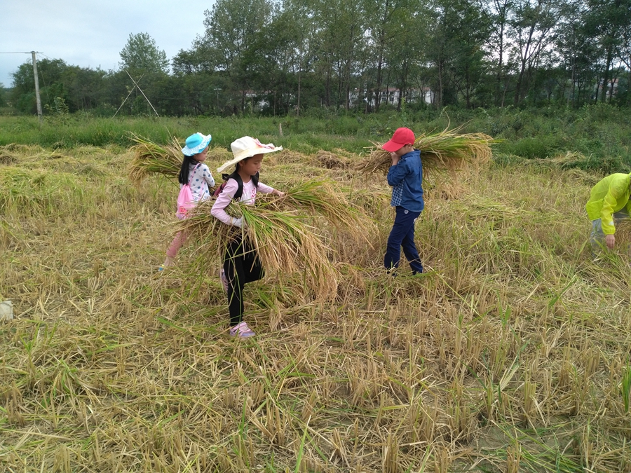 “大家要加油哟,看谁割得快。”“太阳这么晒人,水稻叶子又刺人,种田真不容易呀。”学生们边干活边讨论劳动的艰辛。一块田的水稻很快就被大家收割完,看着自己的劳动成果,同学们开心地笑了。