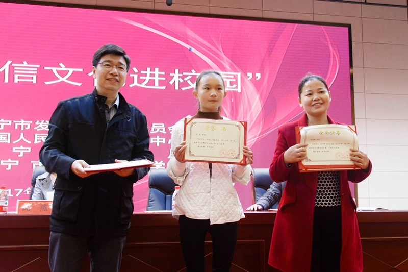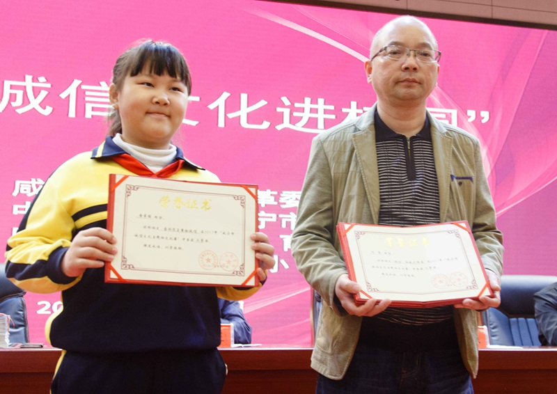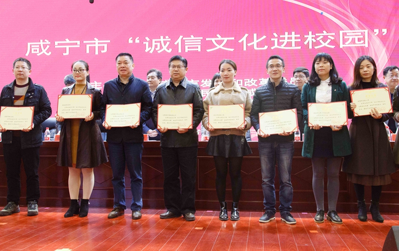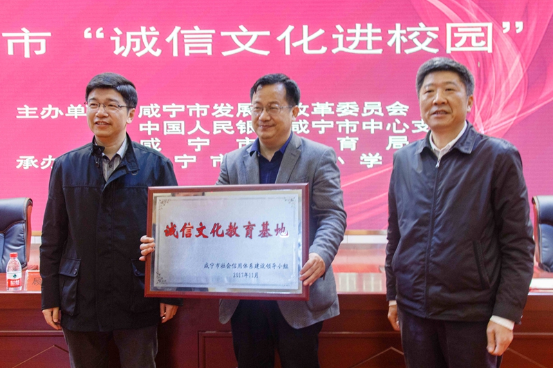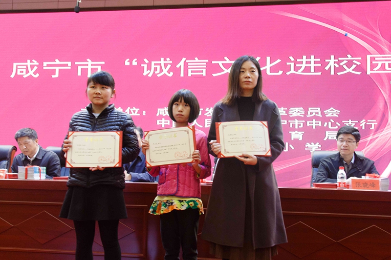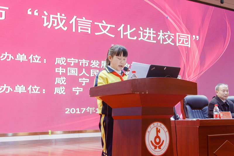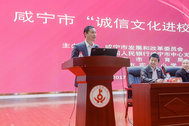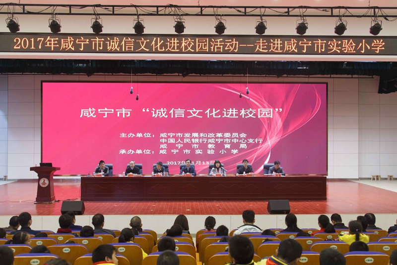 为推动咸宁市创建社会信用体系建设示范城市工作,进一步加强诚信宣传教育,弘扬诚信文化,深入推进诚信文化进校园教育工作,11月13日上午,由市发改委、市人民银行和市教育局共同举办的“咸宁市诚信文化进校园”活动在市实验小学举行。市政府副秘书长顾兴旺、人民银行武汉分行征信管理处副处长沈燕、市发改委主任张善猛、市人民银行副行长张晓峰、市教育局副县级调研员李平等参加活动。参加本次活动的还有各县市区发改局和人民银行的分管领导及工作人员,市诚信文化主题征文比赛部分获奖单位和个人代表,市相关媒体的记者朋友以及市实验小学师生代表近500人。本次活动由市发改委副主任何永志主持。