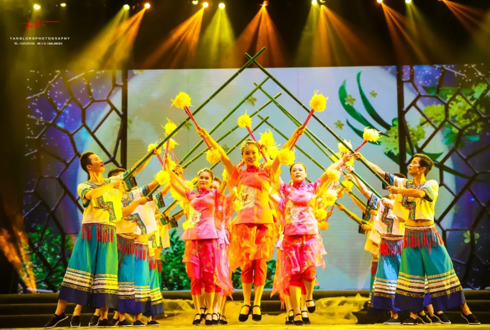 舞台上,演员们手持竹竿张合有度,从容娴雅,时而舒展双臂、时而左右摆荡,男女青年把舞蹈的柔美和刚健表现得淋漓尽致。《打桂花》的舞蹈形式将特色性、艺术性、观赏性融为一体。