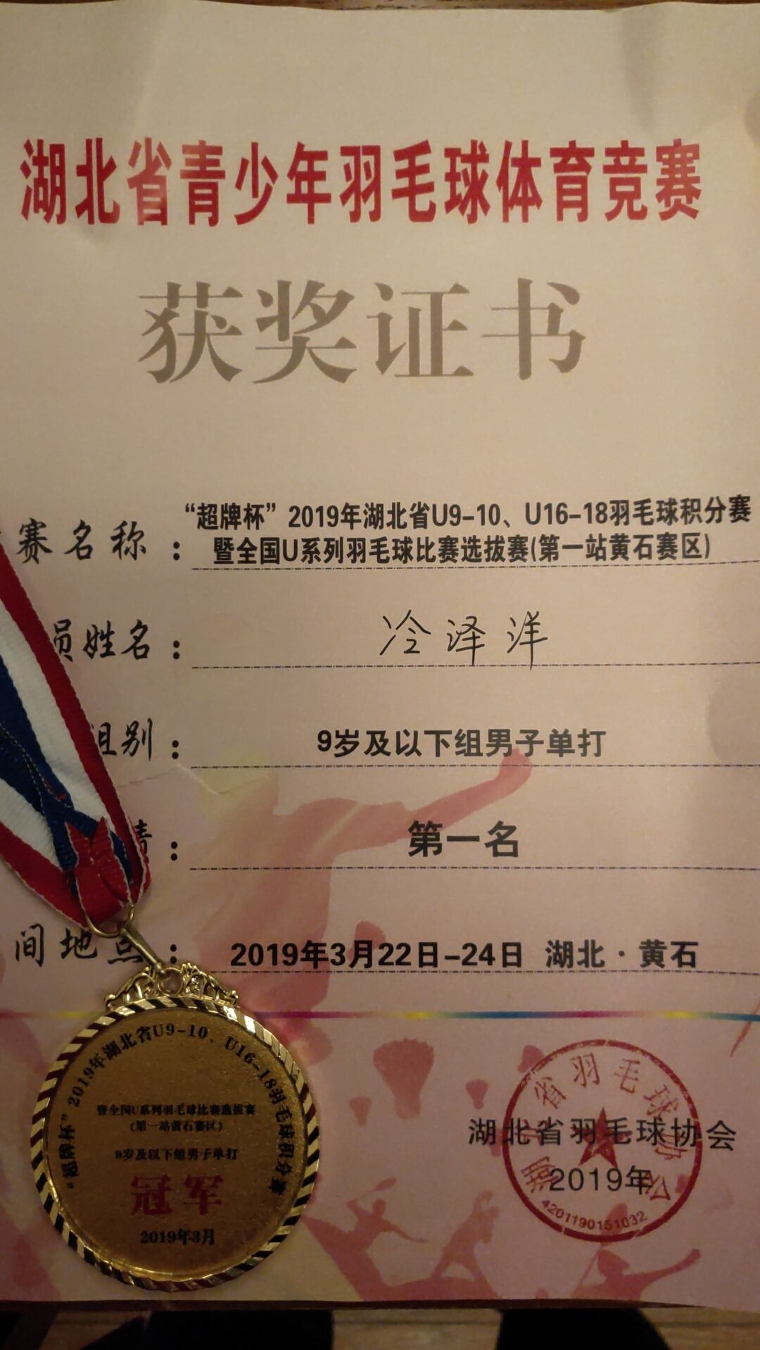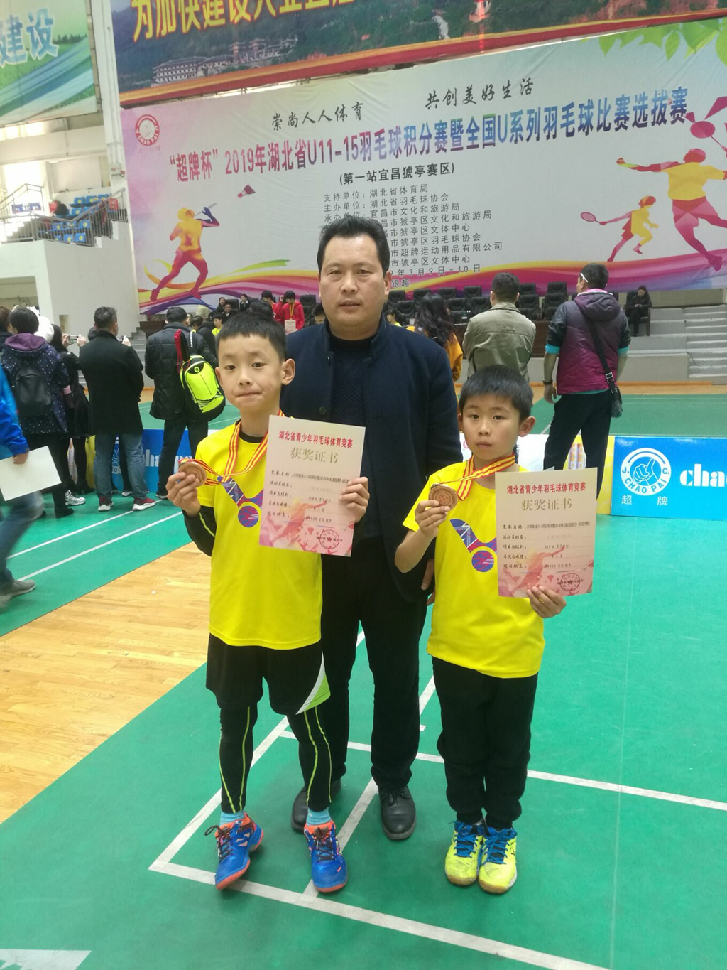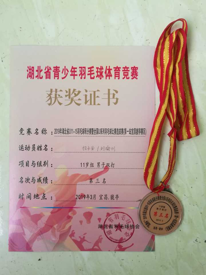 据悉,2019年3月22日至24日,由湖北省体育局、湖北省羽毛球协会主办,宜昌市文化和旅游局承办,黄石市文化和旅游局承办的“超牌杯”2019年湖北省U系列羽毛球比赛暨全国U系列羽毛球选拔赛分别在黄石市体育馆和宜昌市体育馆正式开赛。经过3天的激烈拼搏,在黄石市体育馆进行的湖北省“超牌杯”9岁组羽毛球比赛中,安博(中国)411班运动员冷泽洋比赛中沉着冷静、顽强拼搏,最终荣获9岁组男子单打冠军。同时在宜昌11—15岁组羽毛球赛事中,安博(中国)501班程子安同学在11岁组双打比赛中取得季军的好成绩。双双获奖,可喜可贺,由此两位选手也同时取得代表湖北省参加全国羽毛球锦标赛的机会。