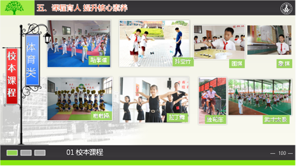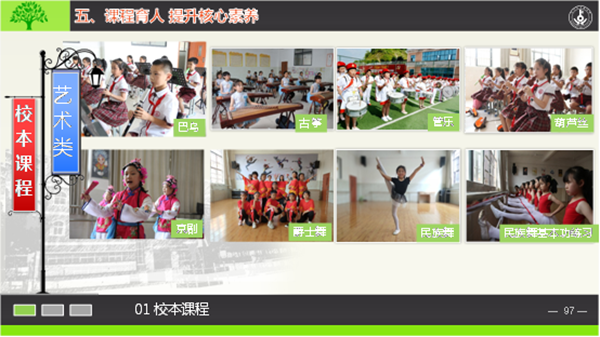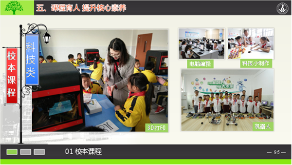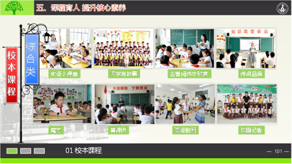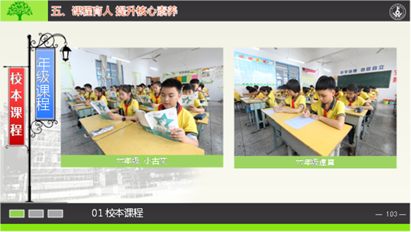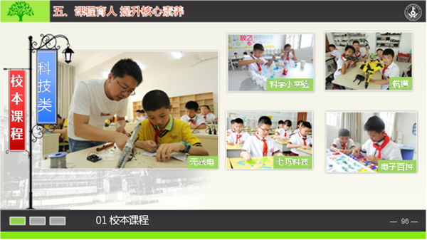 近年来,学校坚持走内涵发展之路,注重课程的整合和优化,开足开齐国家规定课程的同时,每周五下午两节课开设校本课程。两年时间共开发50门课程,共编写了校本课程教材119本。校级课程分为四大类:科技类、艺术类、体育类和综合类,提倡课程引领、课堂生长,促进学生多元发展。科技类共9门课程,15个班,大约500余人。 艺术类课程15门,24个班,约1000人。 体育类14门课程,20个班,共计约600人。 综合类8门课程,20个班,约600人。根据学生的学校特色和学生年龄特点,在一、二年级开设国学和写字课。在六年级开设小古文和速算。